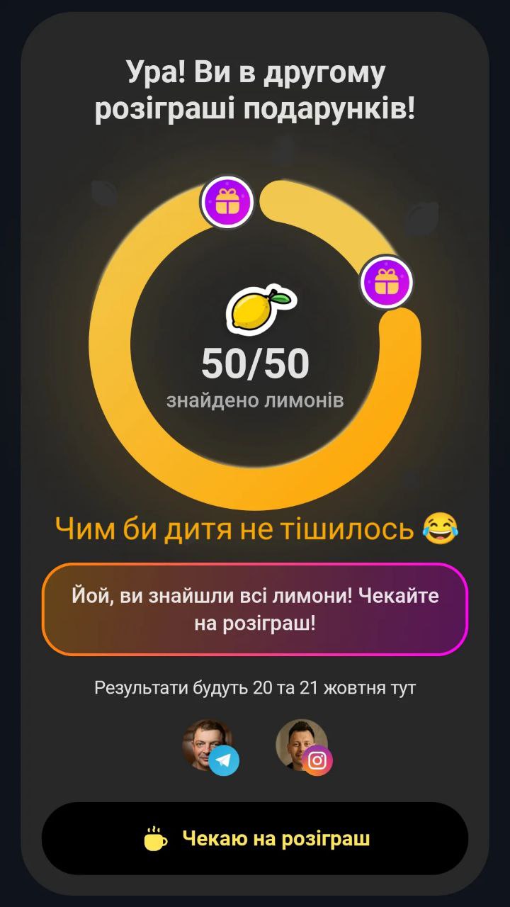 - Найти 50 лимонов – участие в розыгрыше 1 000 000 гривен;
