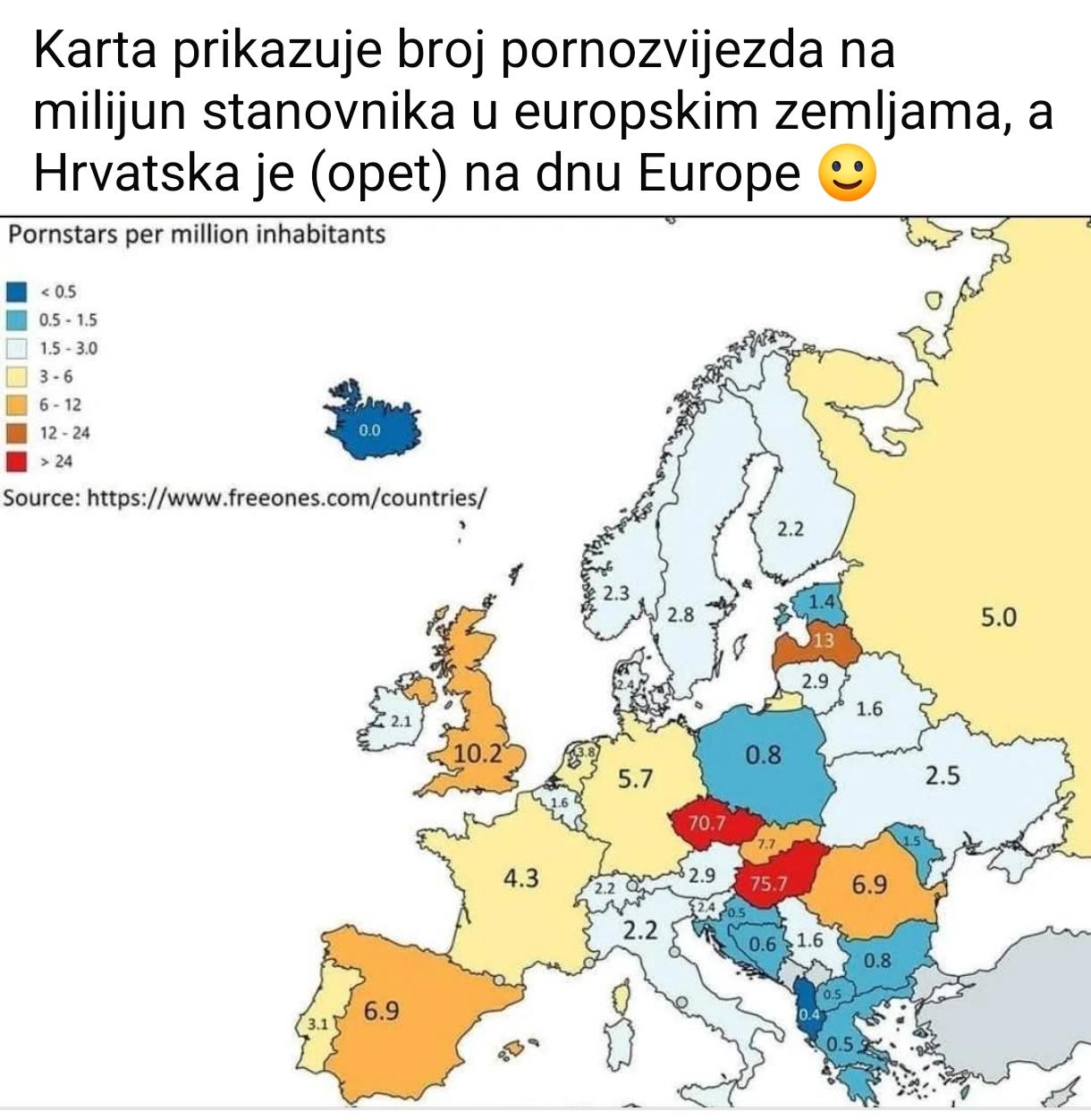 Европа может быть известна и славиться на весь мир своими замками, соборами и кухней, но есть и другие моменты, прославляющие европейцев. В частности, в сети распространяют карту на которой обозначено количество порнозвезд на душу населения в странах Европы.